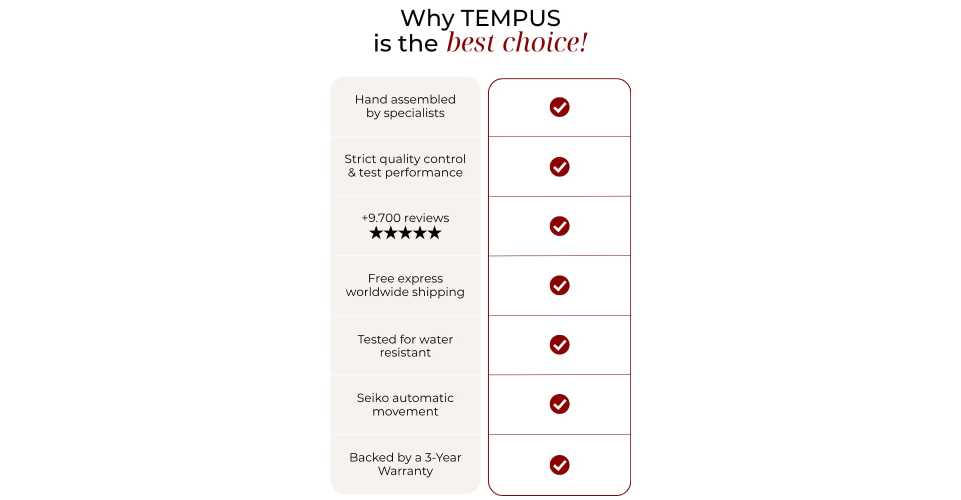 At Tempus, we go beyond watches. Each timepiece comes in a premium custom box with a free adjustment kit for the perfect fit, reflecting our commitment to quality and detail.