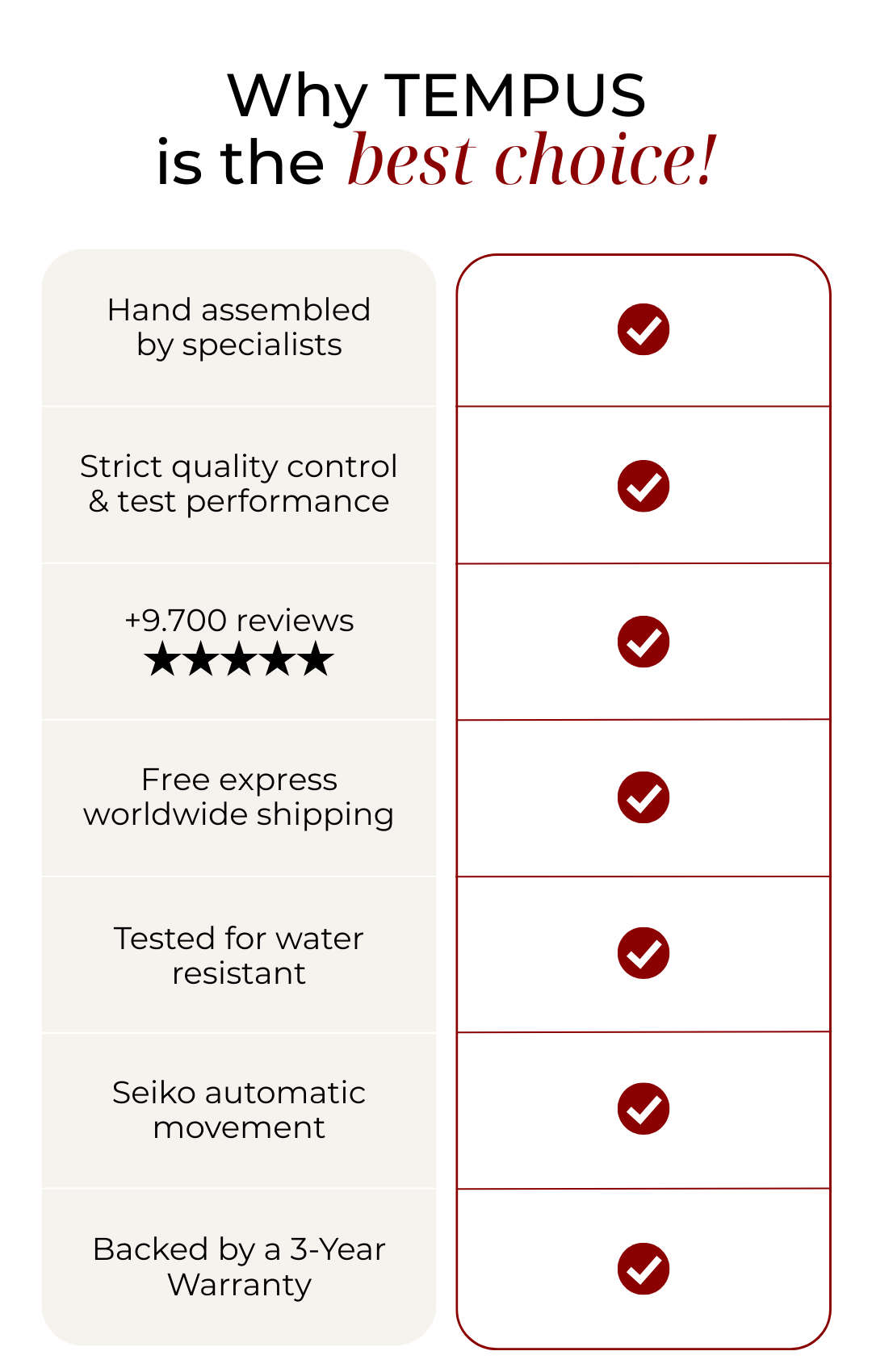 At Tempus, we go beyond watches. Each timepiece comes in a premium custom box with a free adjustment kit for the perfect fit, reflecting our commitment to quality and detail.